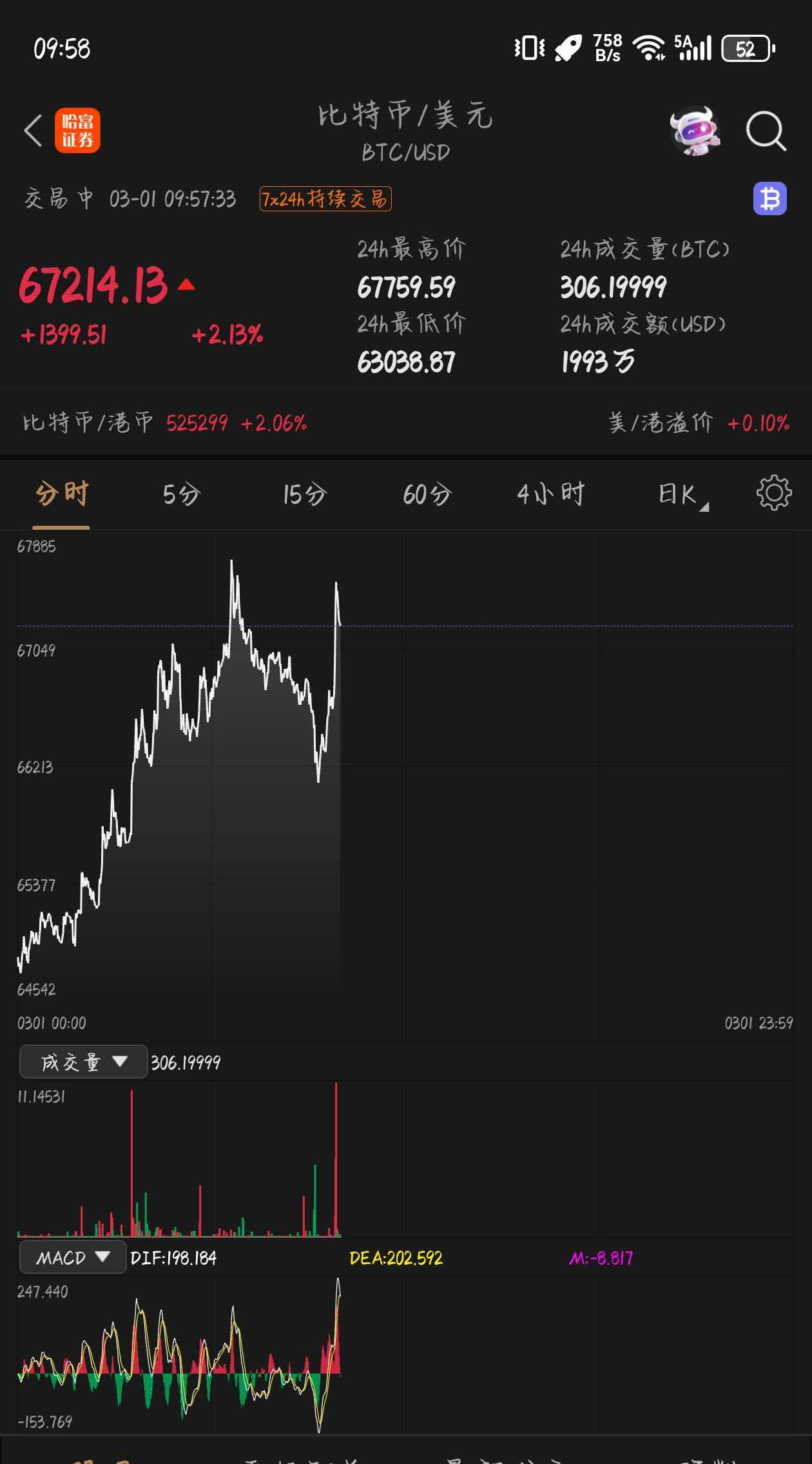 3月1日上午,交易行情显示,比特币迅速反弹2%,截至发稿报67214.13美元。