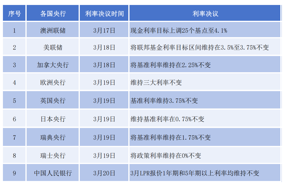 值得注意的是,在一众维持利率不变的央行之外,面对通胀的意外反弹和地缘政治风暴的逼近,澳大利亚储备银行(央行)在3月17日的货币政策会议上决定将现金利率目标上调25个基点至4.1%。这一决议标志着澳大利亚央行在遏制“死灰复燃”的通胀与维护脆弱经济复苏之间,暂时选择了前者。