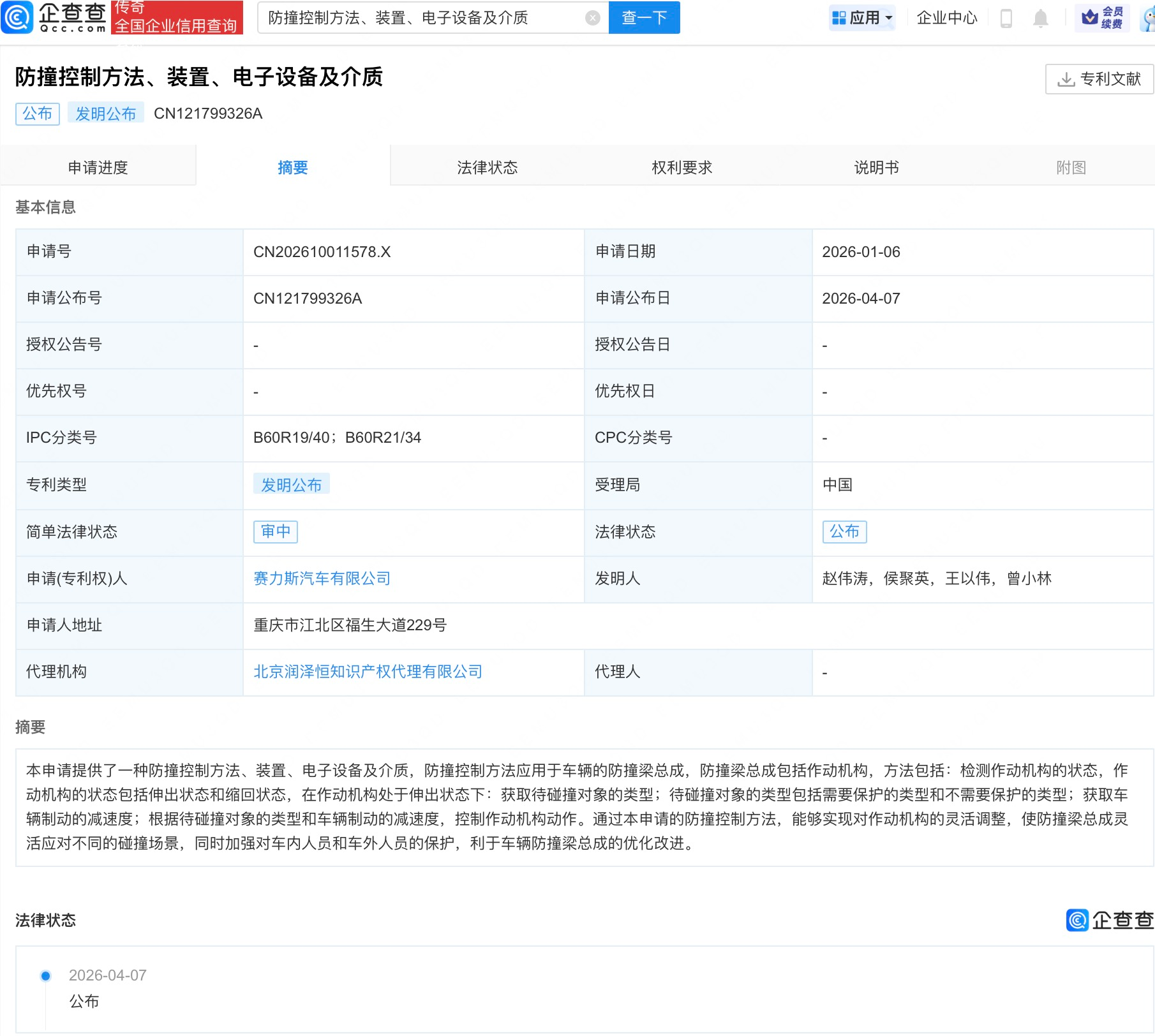赛力斯防撞控制专利公布