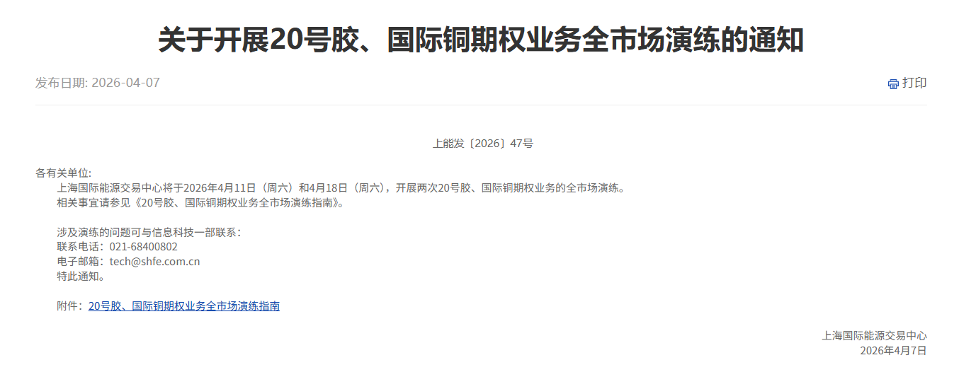4月7日,上海国际能源交易中心发布关于开展20号胶、国际铜期权业务全市场演练的通知,将于2026年4月11日(周六)和4月18日(周六),开展两次20号胶、国际铜期权业务的全市场演练。
