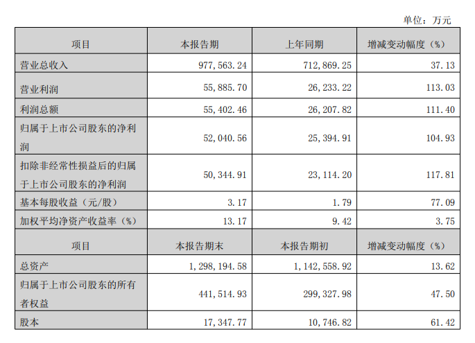 基本每股收益3.17元,上年同期为1.79元,同比增长77.09%。