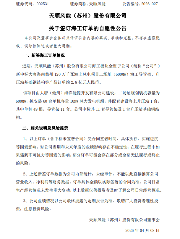 4月7日,天顺风能(002531.SZ)公告称,公司海工板块全资子公司近期新中标大唐海南儋州120万千瓦海上风电项目二场址(600MW)海工导管架、升压站基础钢结构等产品订单,金额约2.8亿元人民币。该项目由大唐(儋州)海洋能源开发有限公司建设,二场址规划装机容量为600MW,拟安装60台单机容量10MW风力发电机组,并配套建设海上升压站1台,其中单桩49根,导管架11套。公司中标其11套导管架及1台升压站基础钢结构。