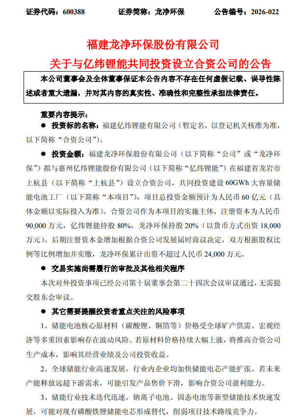 4月7日,龙净环保(600388.SH)公告称,公司拟与惠州亿纬锂能股份有限公司在福建省龙岩市上杭县共同投资设立合资公司,建设60GWh大容量储能电池工厂。项目总投资预计为60亿元,合资公司注册资本9亿元,其中龙净环保持股20%,以货币出资1.8亿元,累计出资不超过2.4亿元;亿纬锂能持股80%。