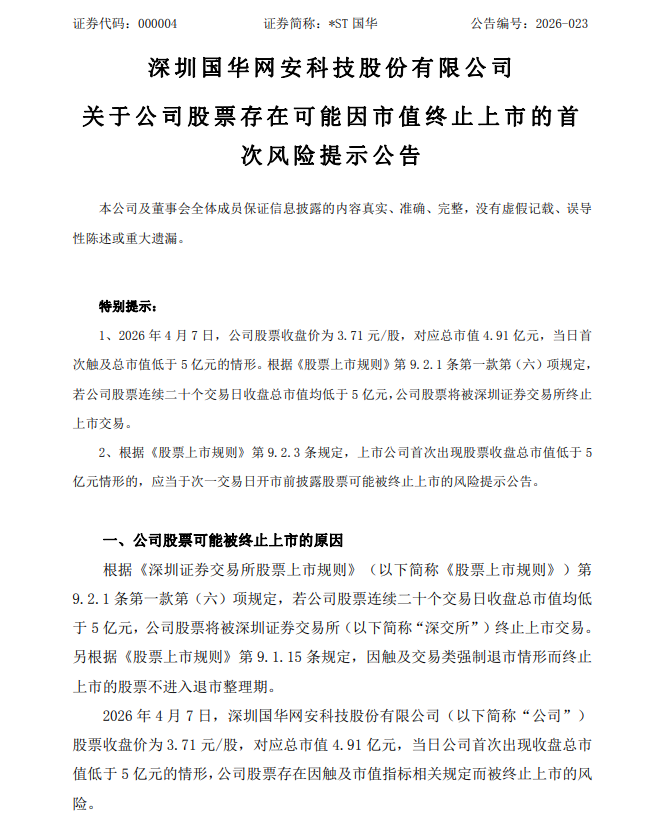 4月7日,*ST国华(000004.SZ)公告称,2026年4月7日公司股票收盘价为3.71元/股,对应总市值4.91亿元,当日首次触及总市值低于5亿元的情形。若连续二十个交易日收盘总市值均低于5亿元,公司股票将被深交所终止上市,且不进入退市整理期。