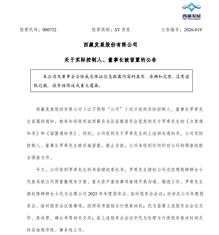 4月7日,ST西发(000752.SZ)公告称,公司近日收到通知,实际控制人、董事长罗希被西藏自治区监察委员会实施留置。截至目前,公司未收到针对公司的调查文件。罗希已授权总经理陈婷婷代表其推进预重整及重大资产重组事项,并代为出席股东会行使表决权;副董事长廖川代为履行董事长职责。